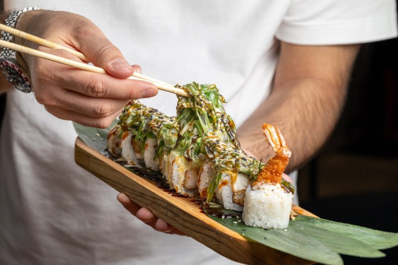 Сливочный сыр, Авокадо, Креветка в кляре, Салат Чука, Соус Шик, Унаги соус, Кунжут.