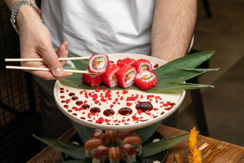 Икра Масаго, Творожный сыр, Лосось, Авокадо.