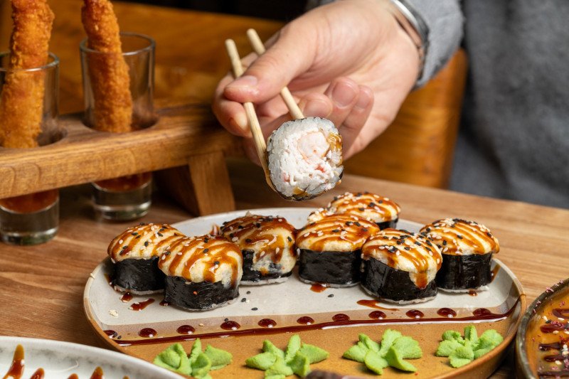 Нори, Креветка Тигровая,"Краб с фирменным соусом", Сырная шапочка, Соус унаги и Кунжут.