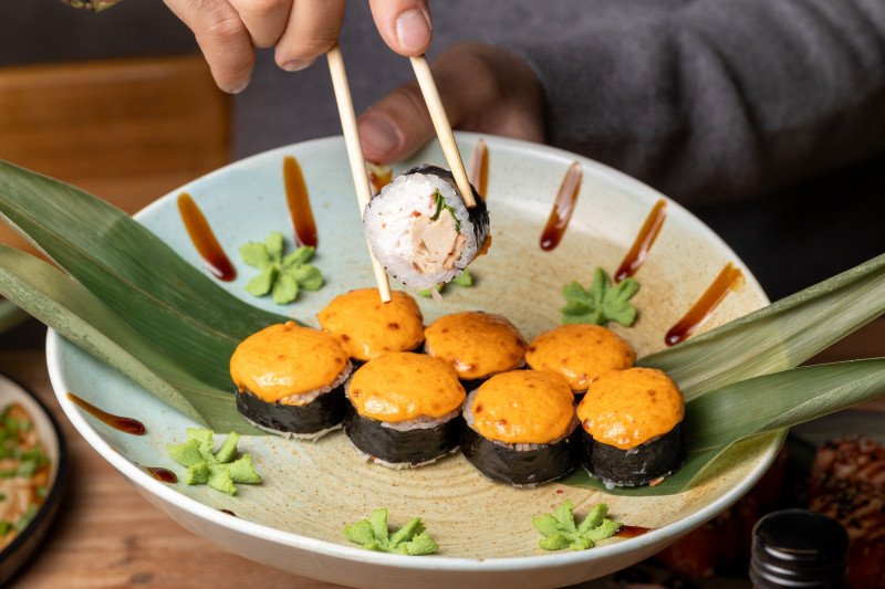 Нори, Сыр Сливочный, Омлет Японский, курица, Лук Зеленый, соус Спайси.