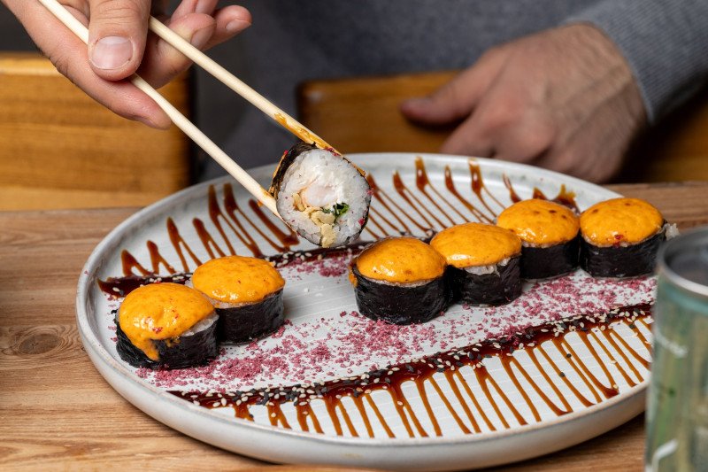Нори, Сыр Сливочный, Омлет Японский,Тигровая Креветка, Лук Зеленый, соус Спайси.